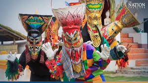 Elaborate festival masks displayed in cultural tourism centers, representing various Buddhist deities and local folklore.